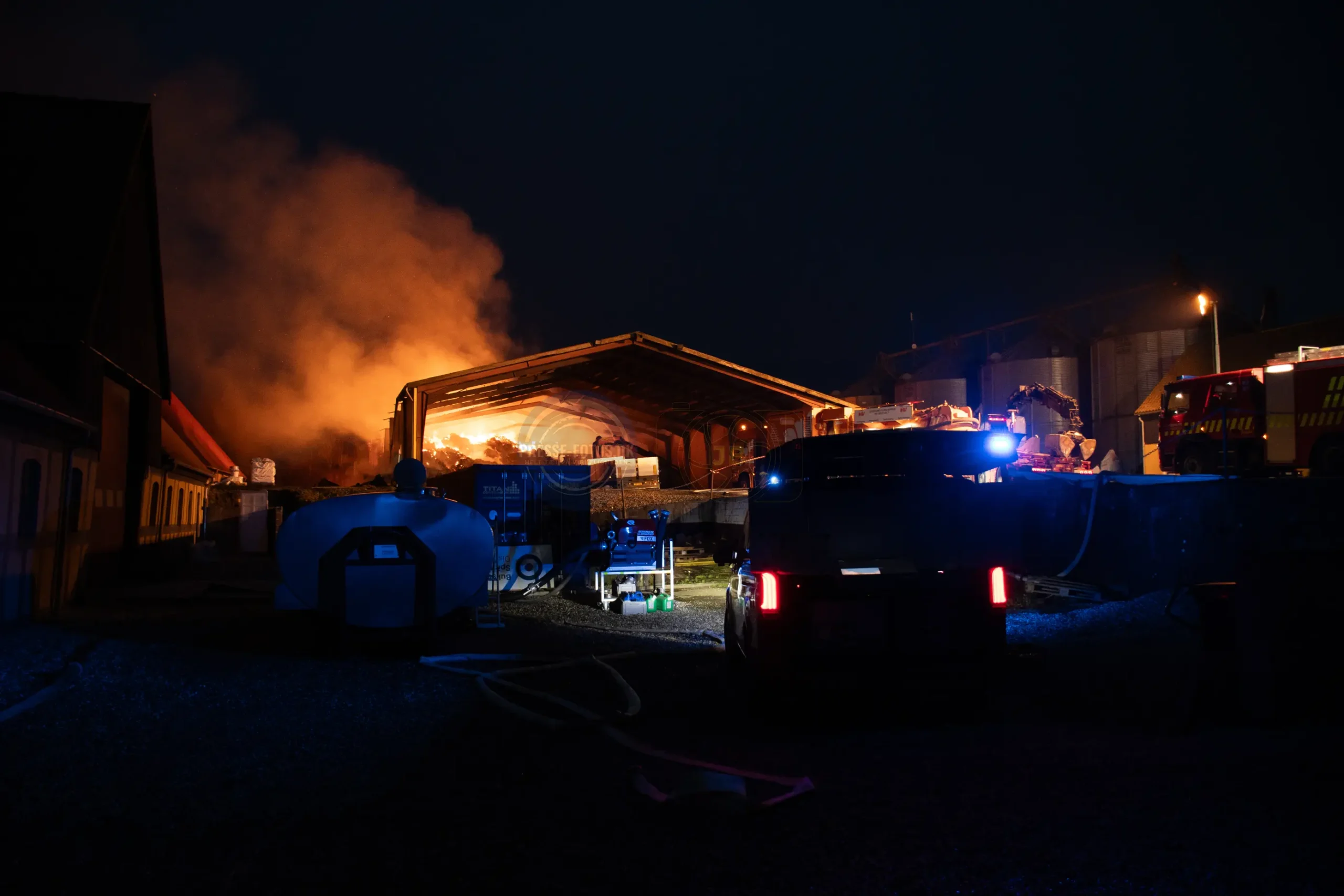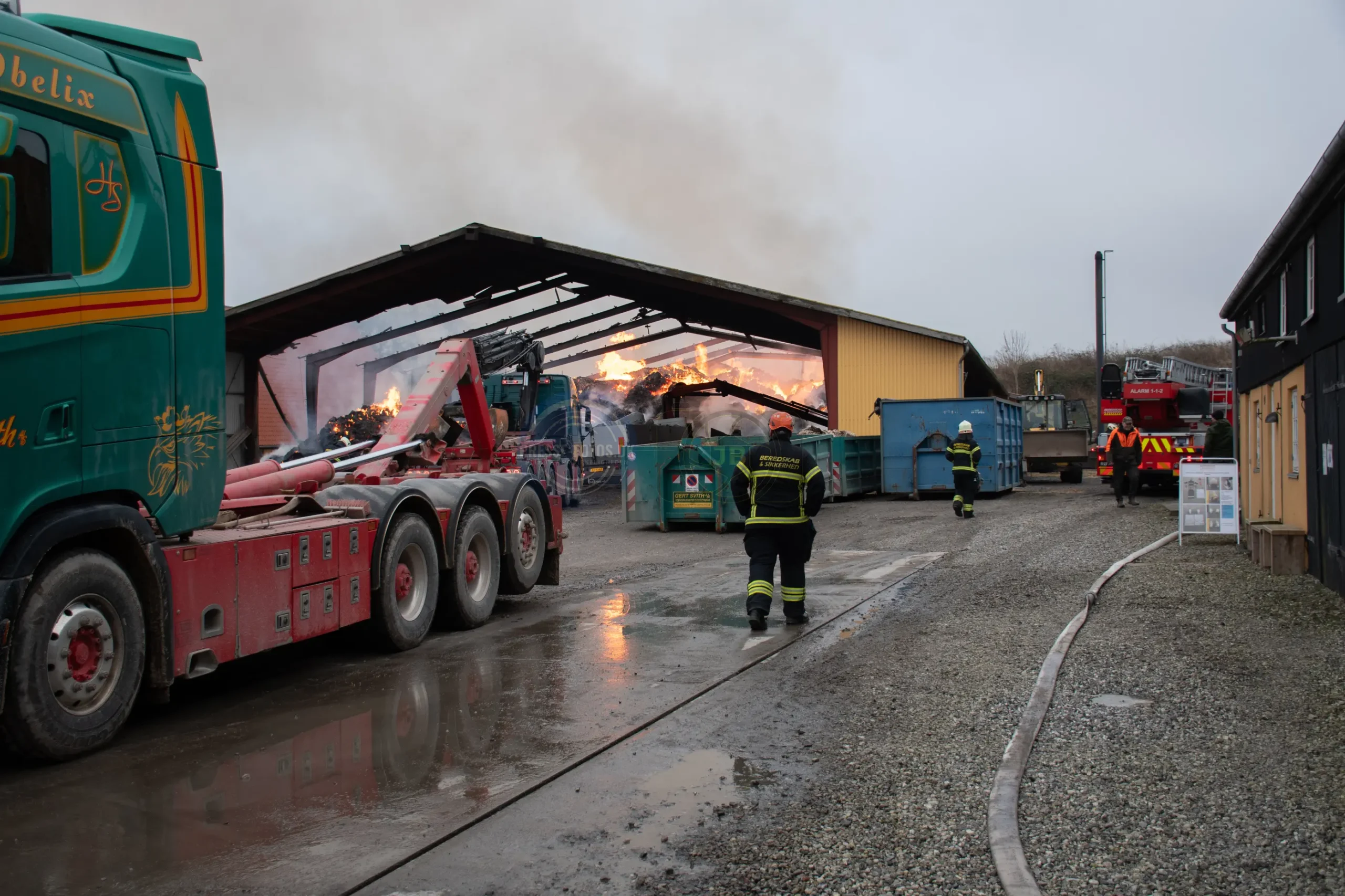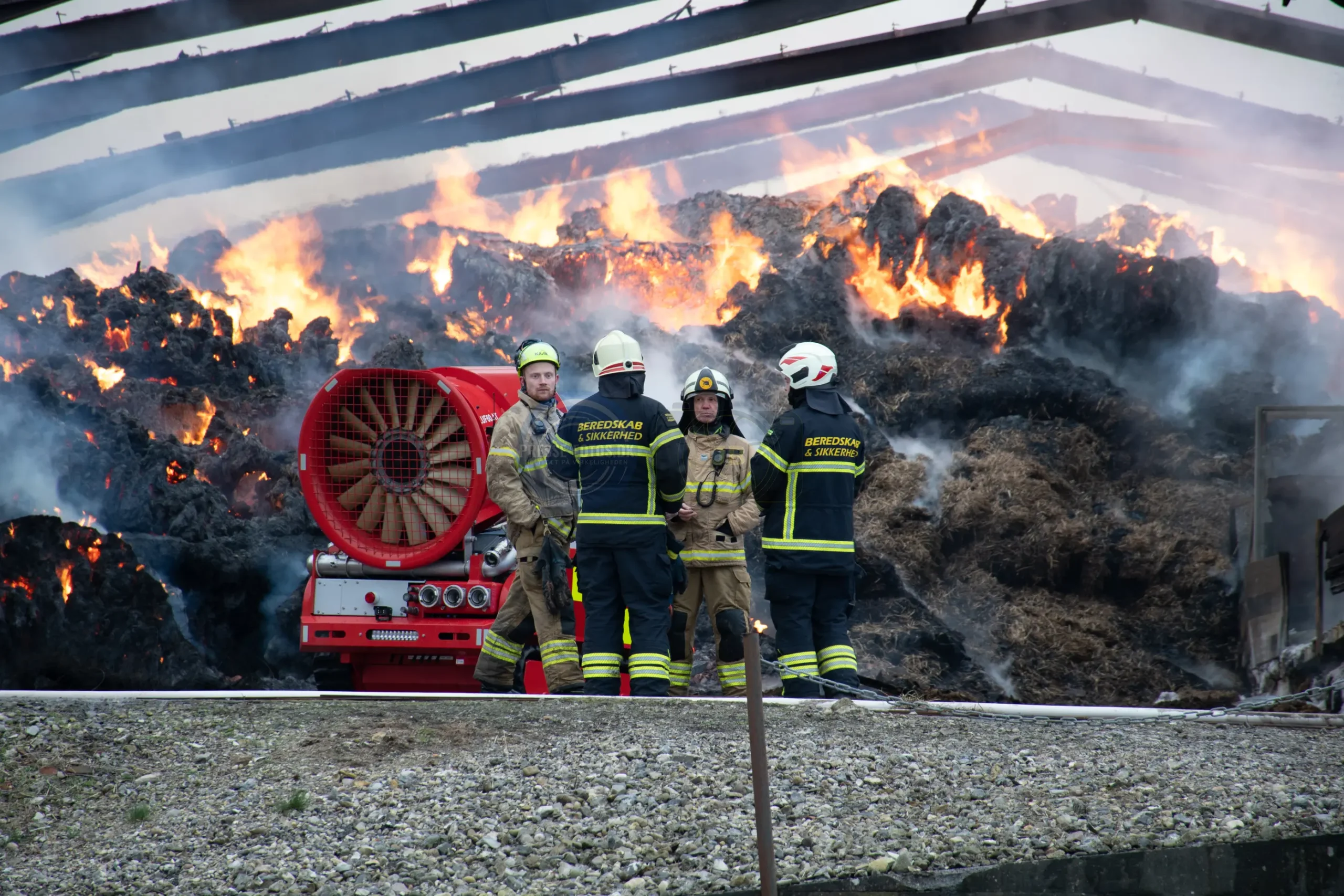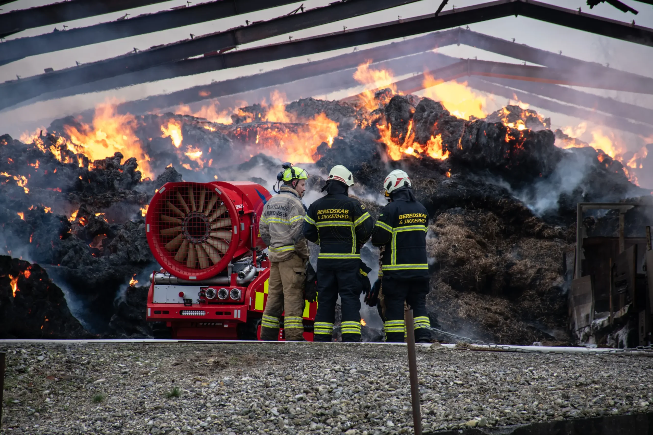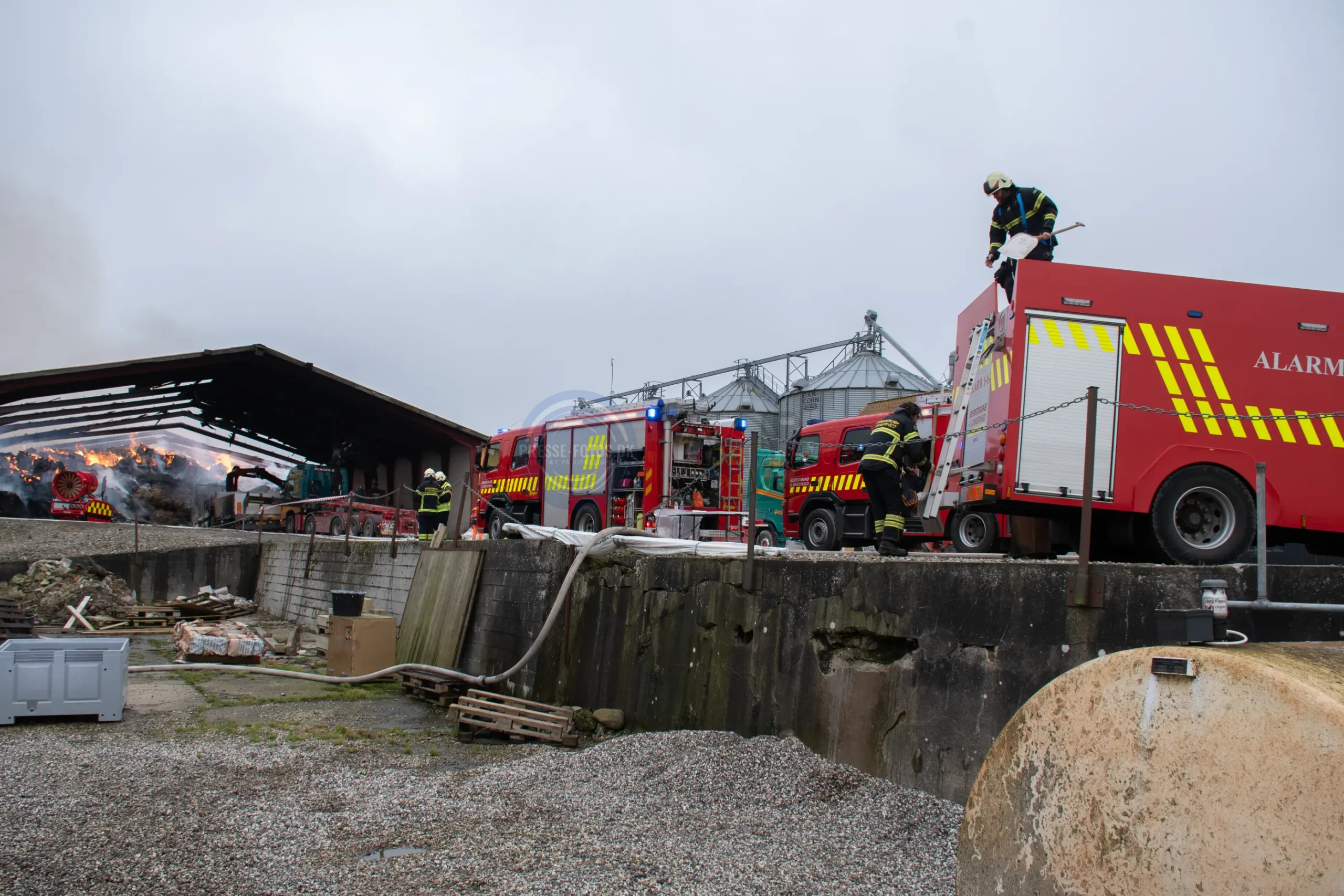 Den store lade står tæt på flere bygninger som hører til godset og derfor er er det vigtigt at få styr på brandspredningen.