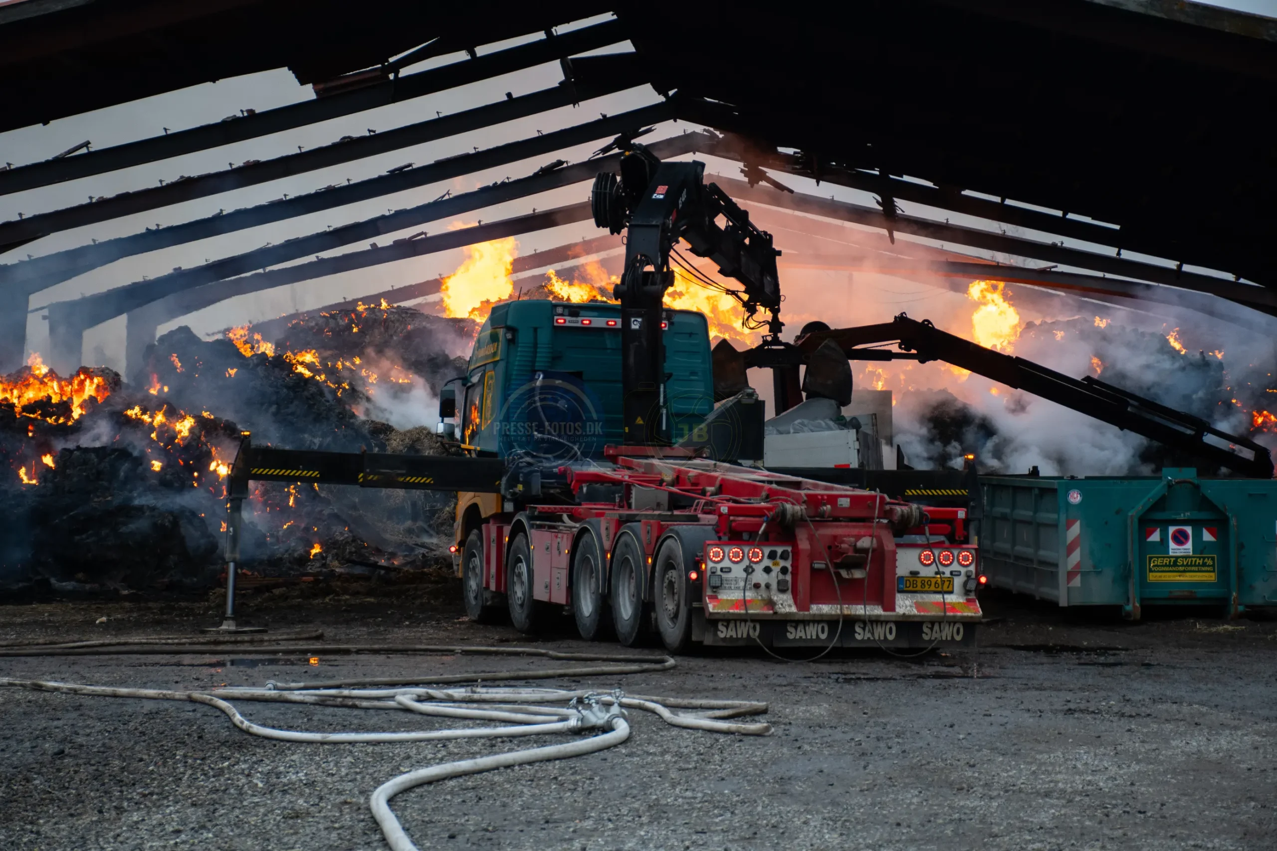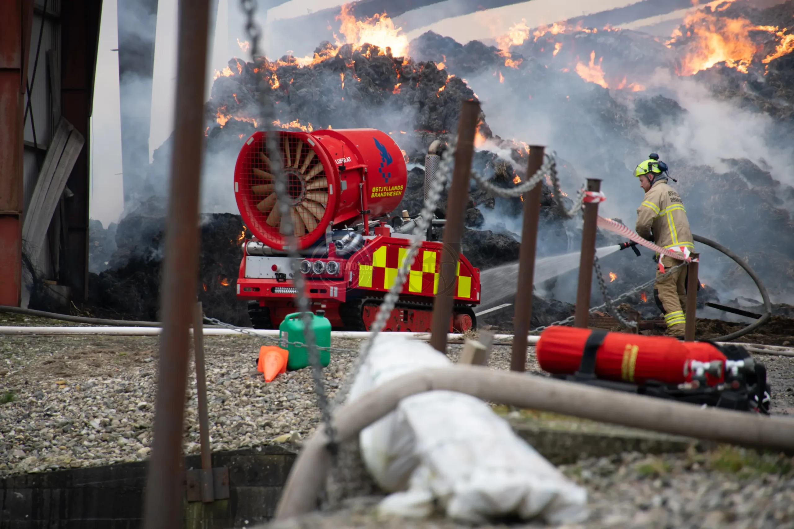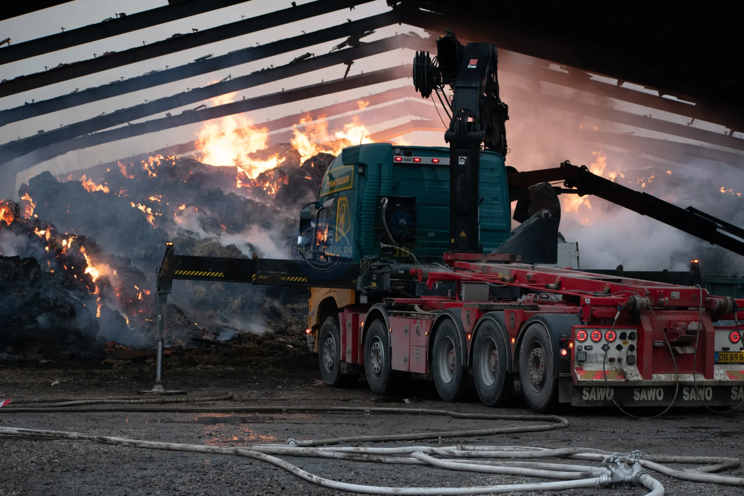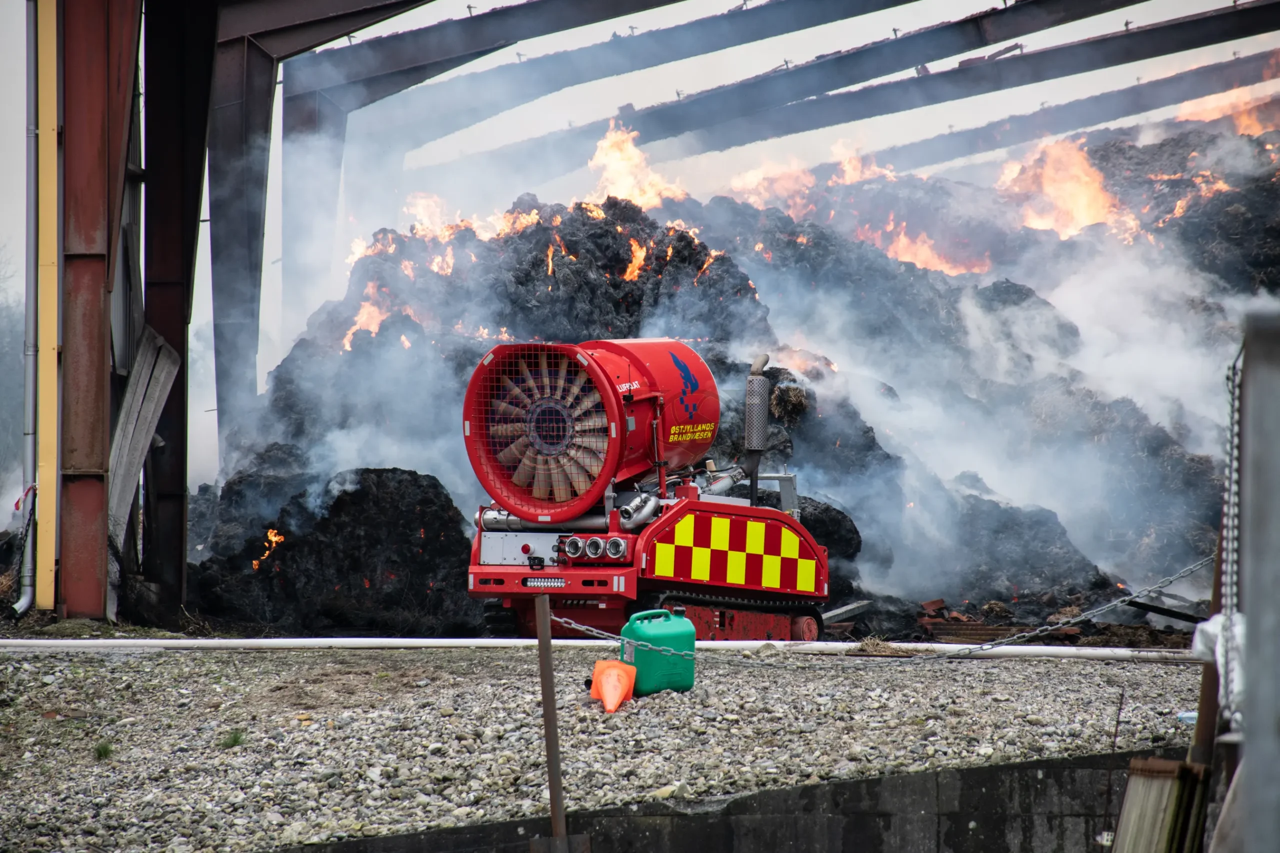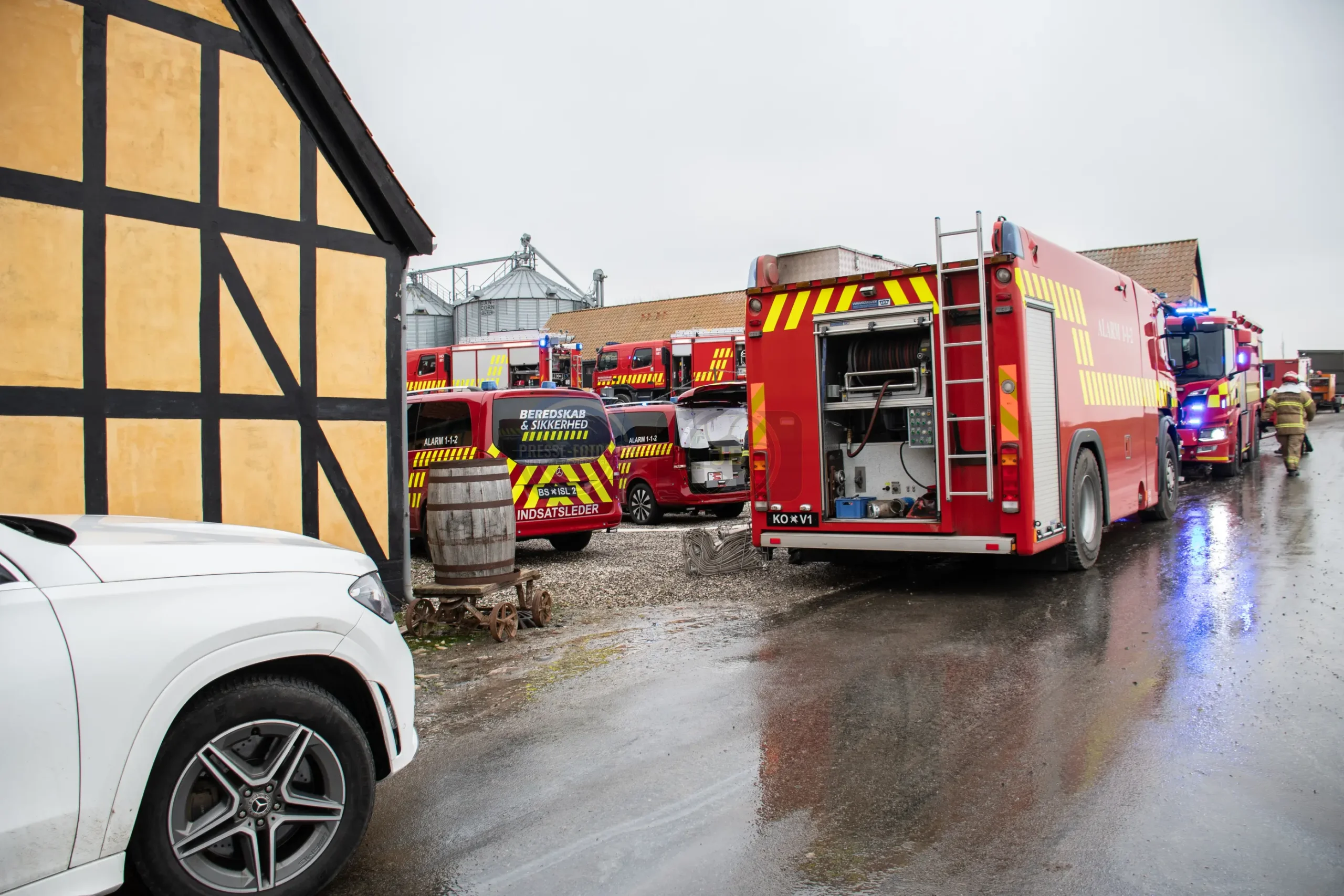 Den store lade står tæt på flere bygninger som hører til godset og derfor er er det vigtigt at få styr på brandspredningen.
