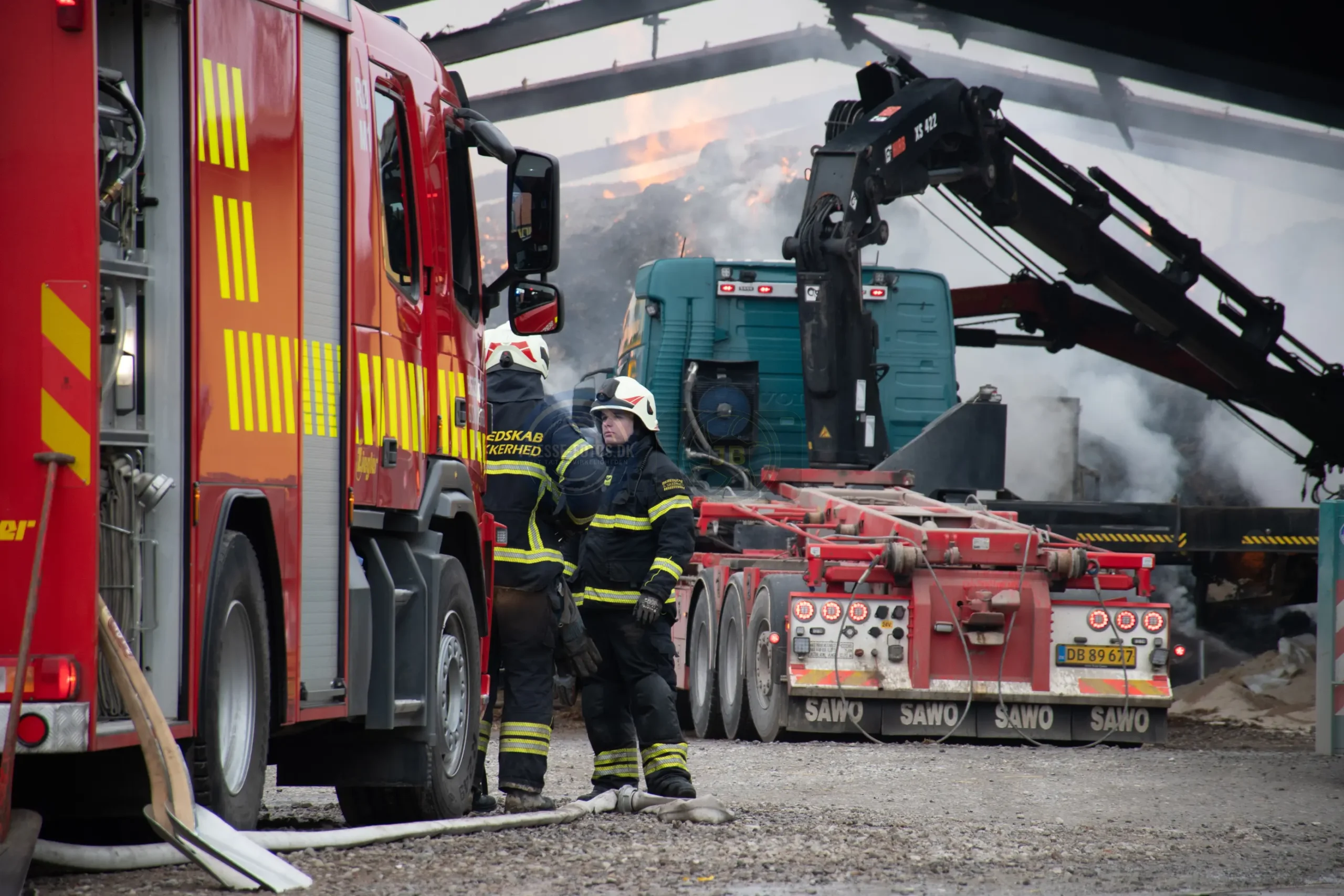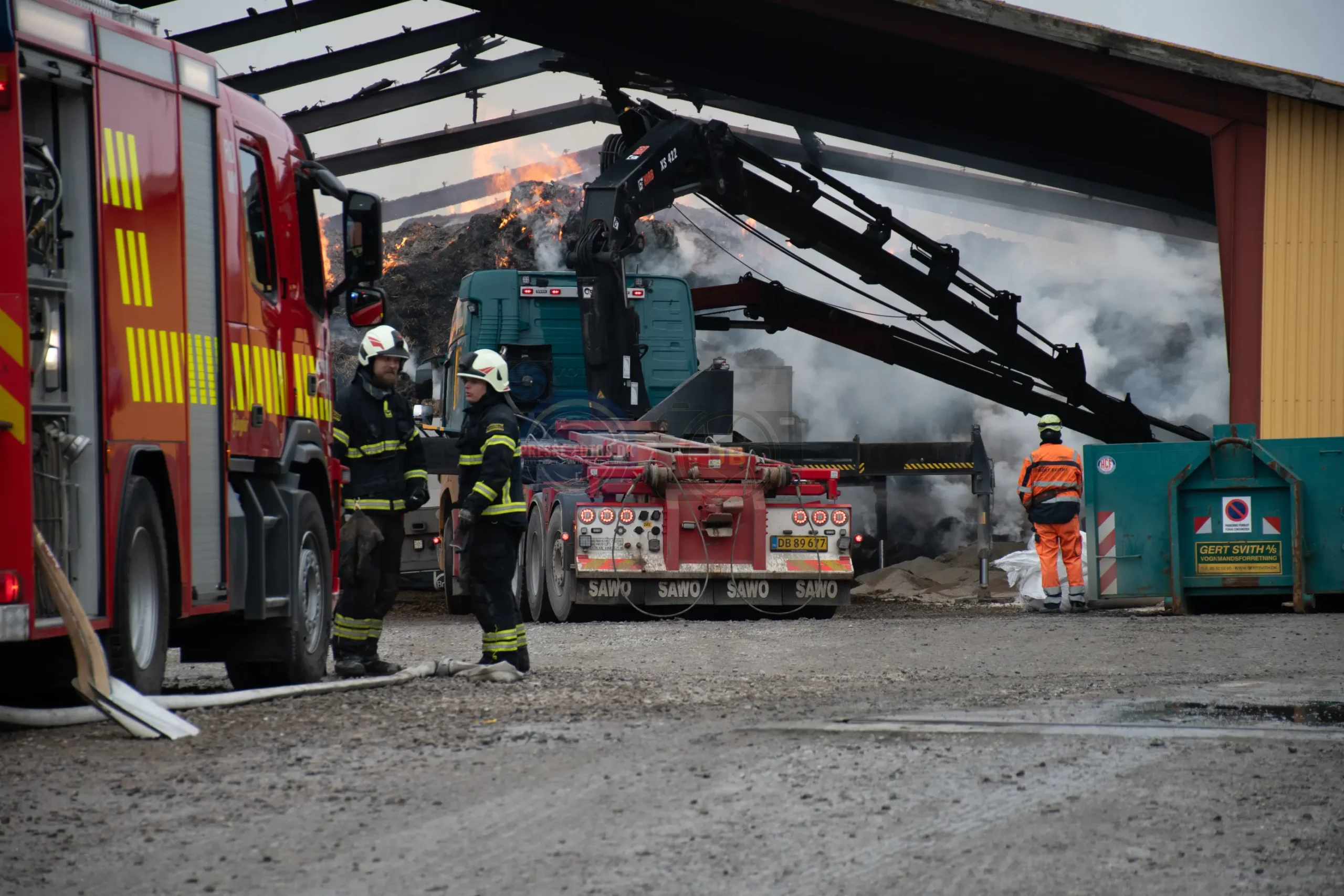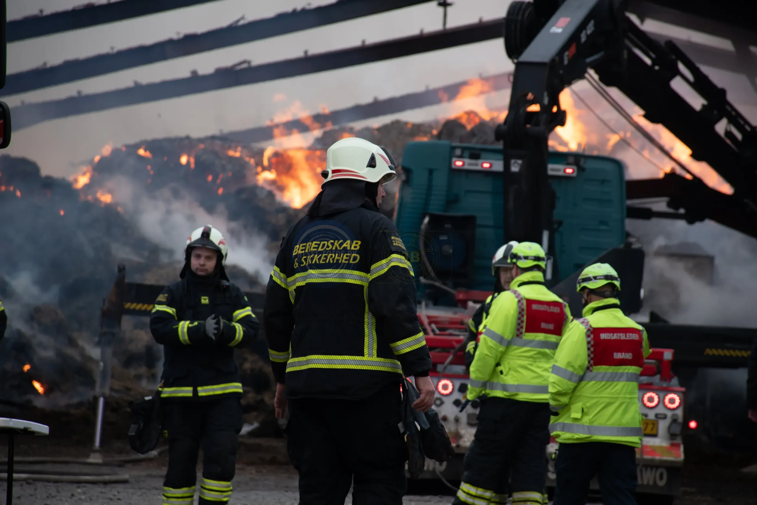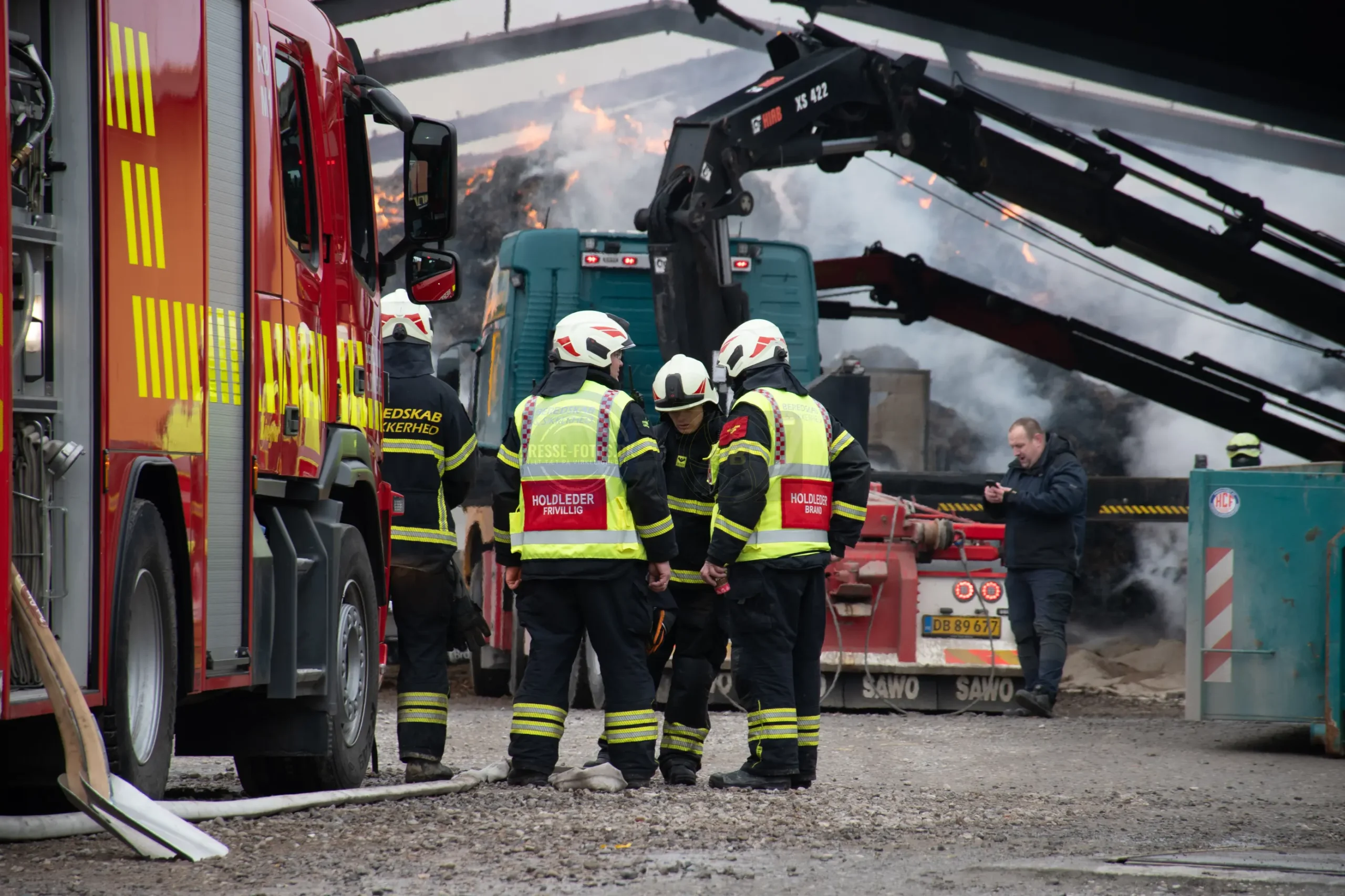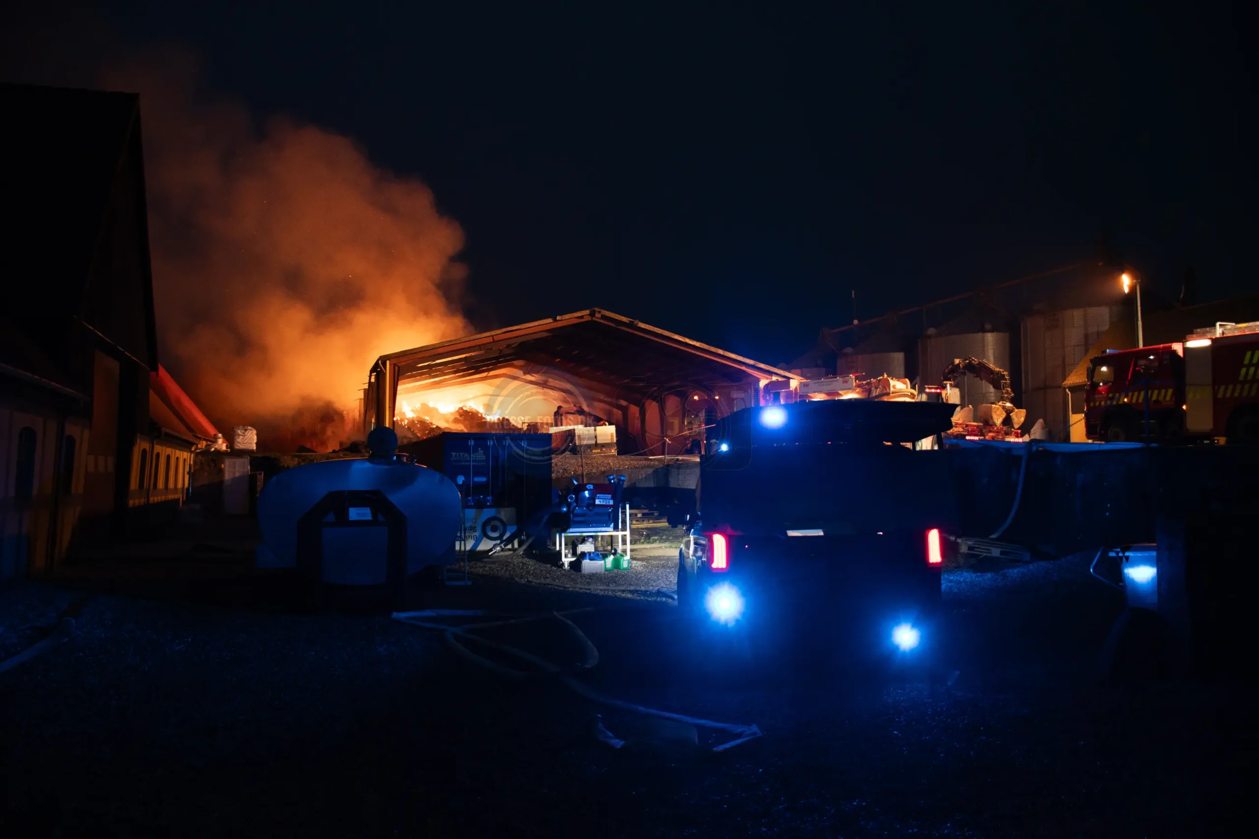 Den store lade står tæt på flere bygninger som hører til godset og derfor er er det vigtigt at få styr på brandspredningen.