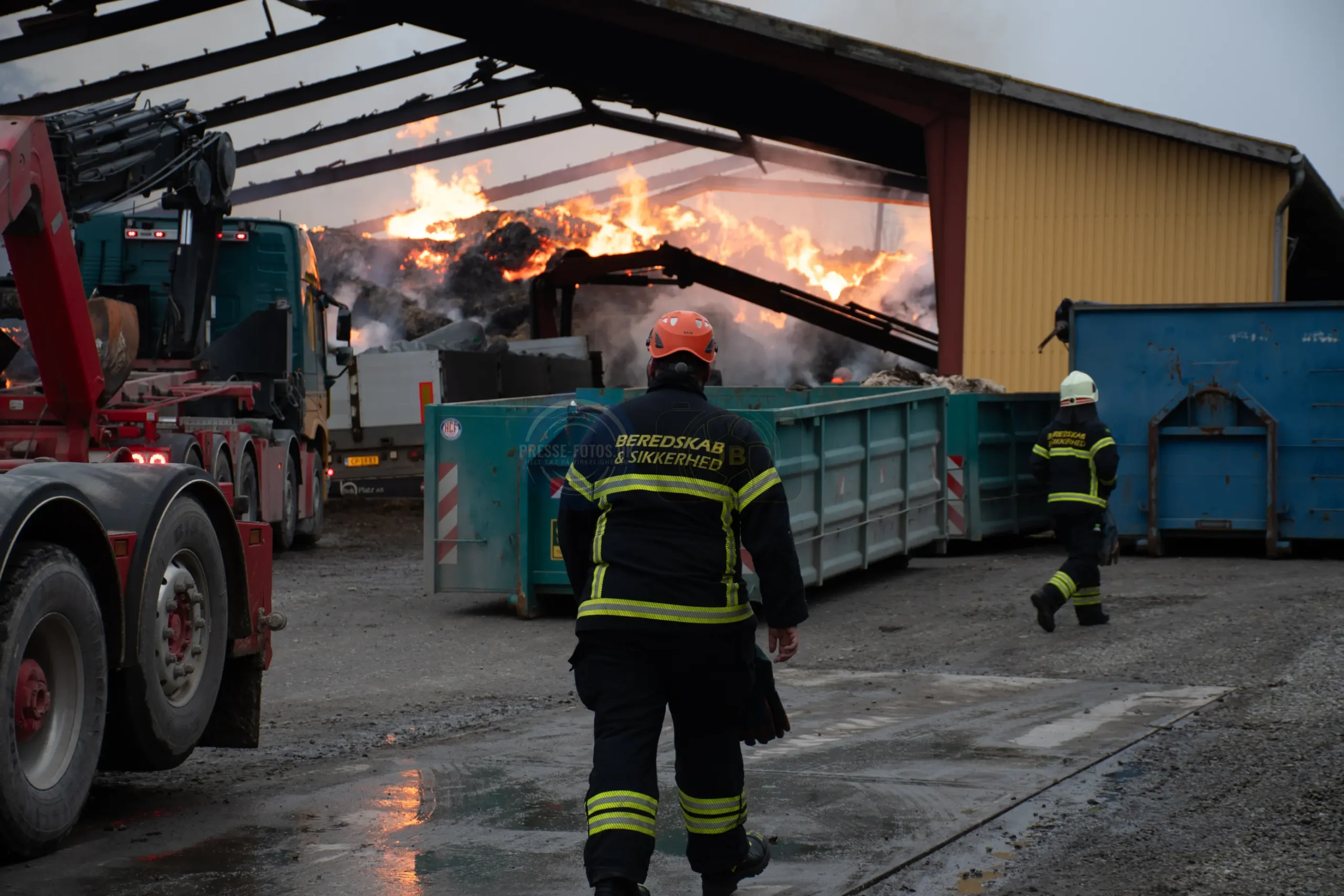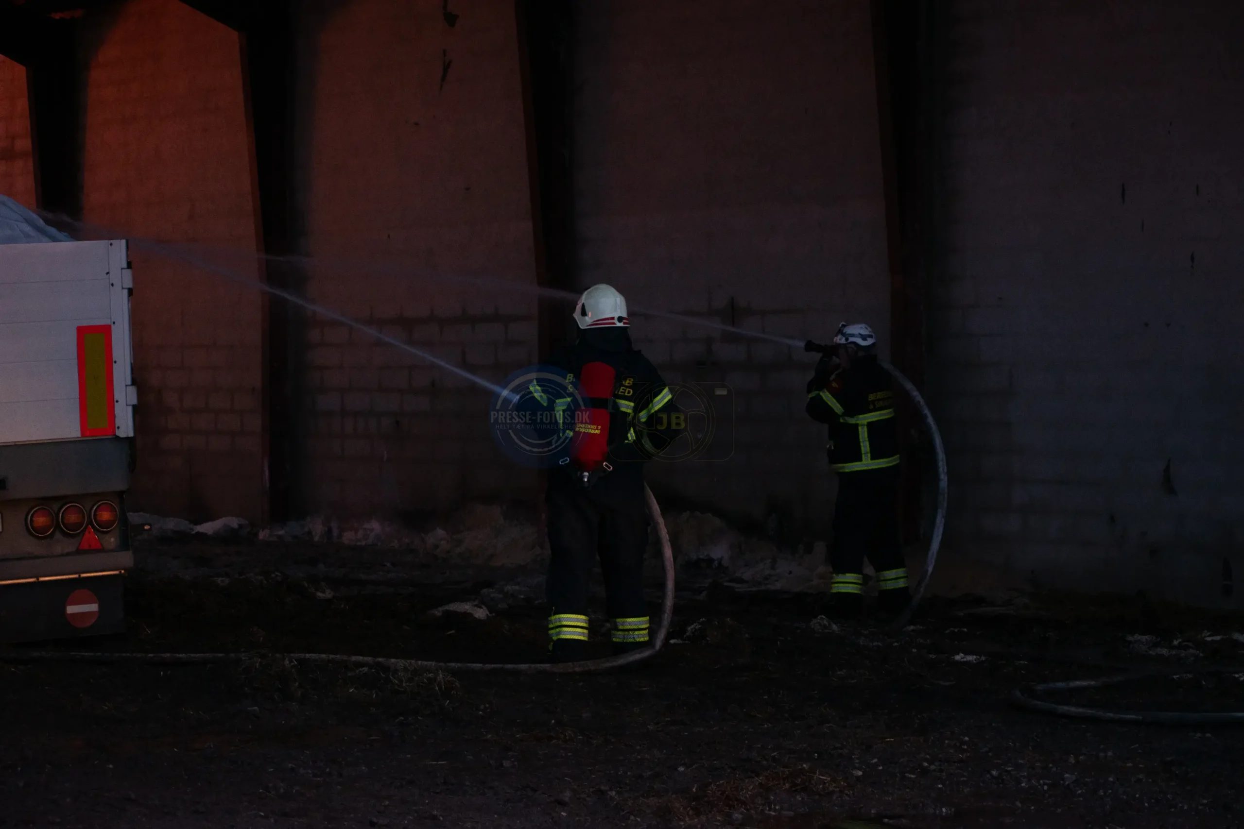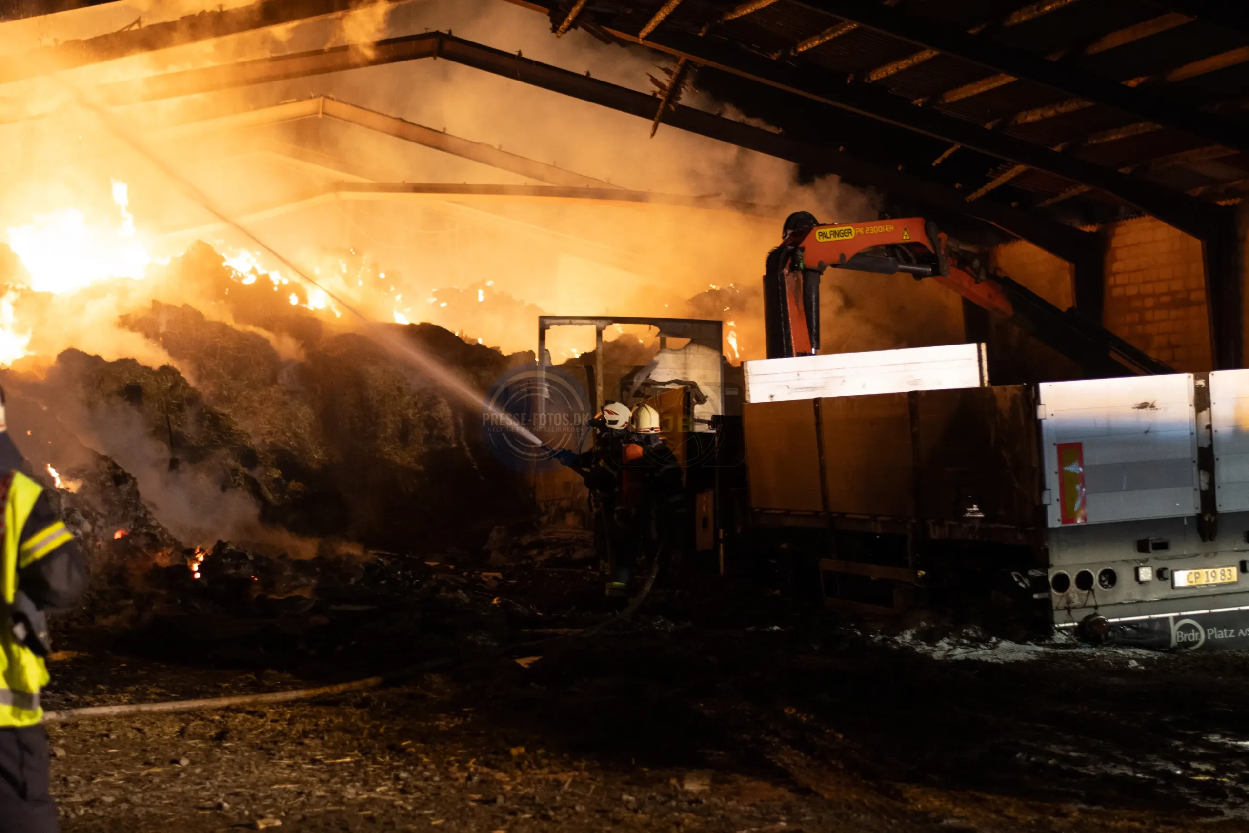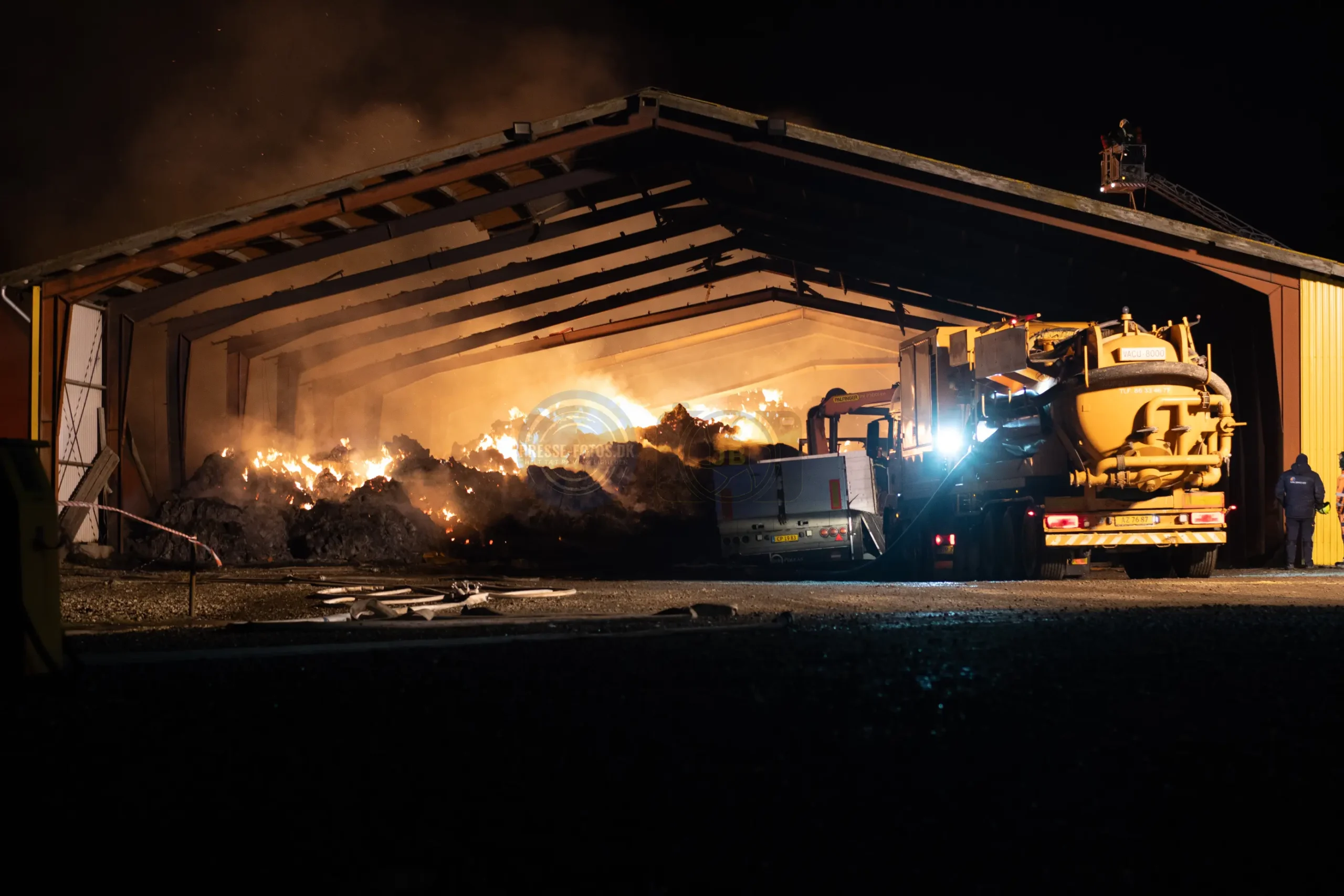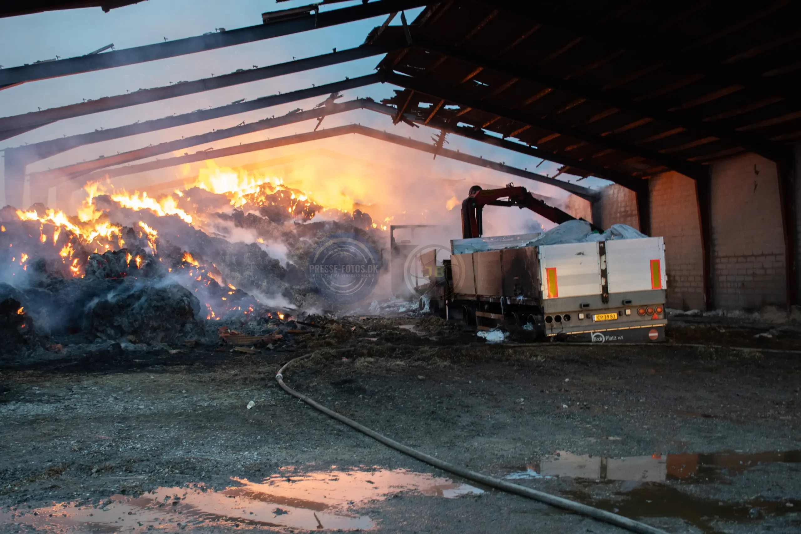 Branden er startet i en lastbil, som står inde i laden. Lastbilen var i gang med at læse kunstgødning af, da der opstod brand under køretøjet og flammerne fik fat i lastbilen og laden ved ved det historiske Møllerup Gods ved Rønde på Djursland.