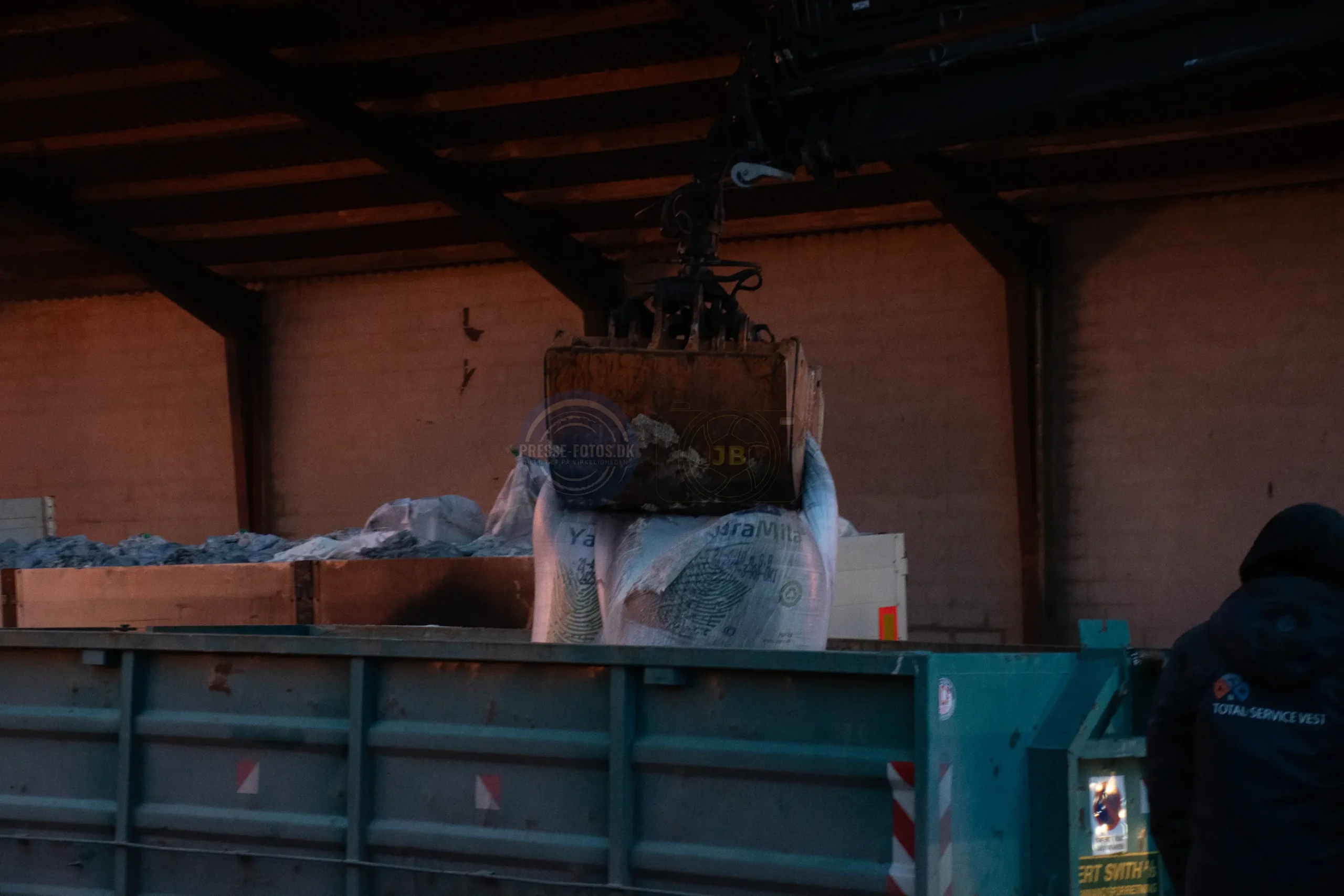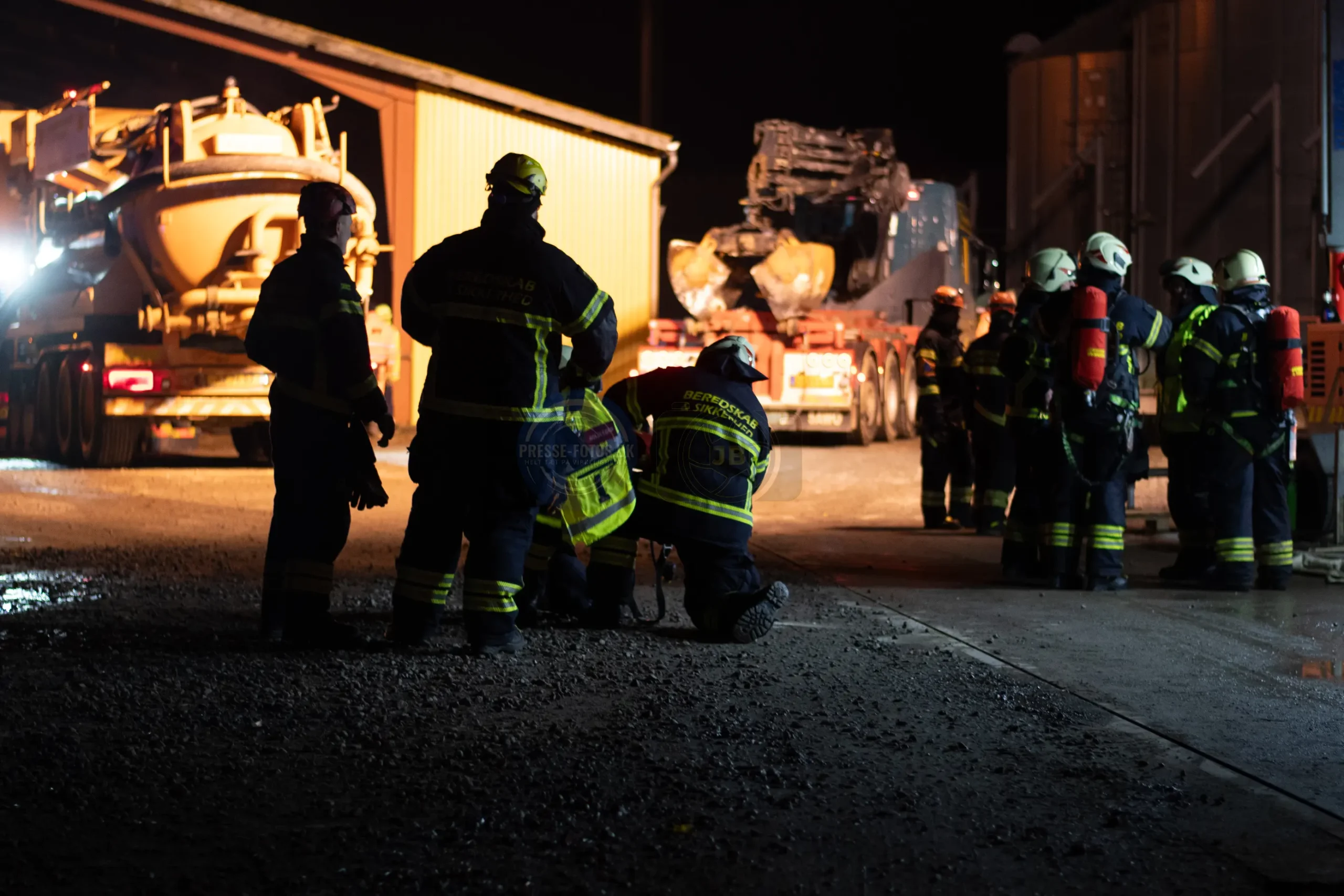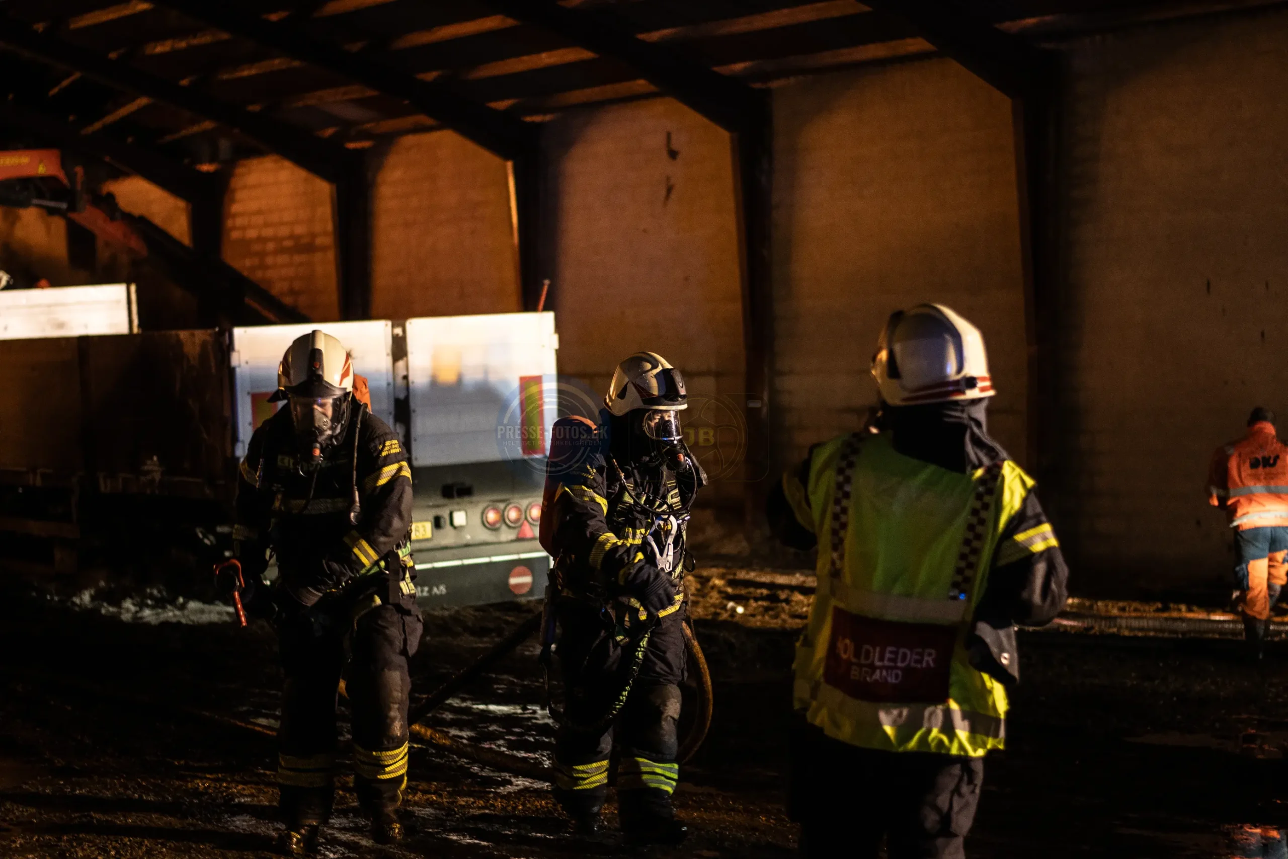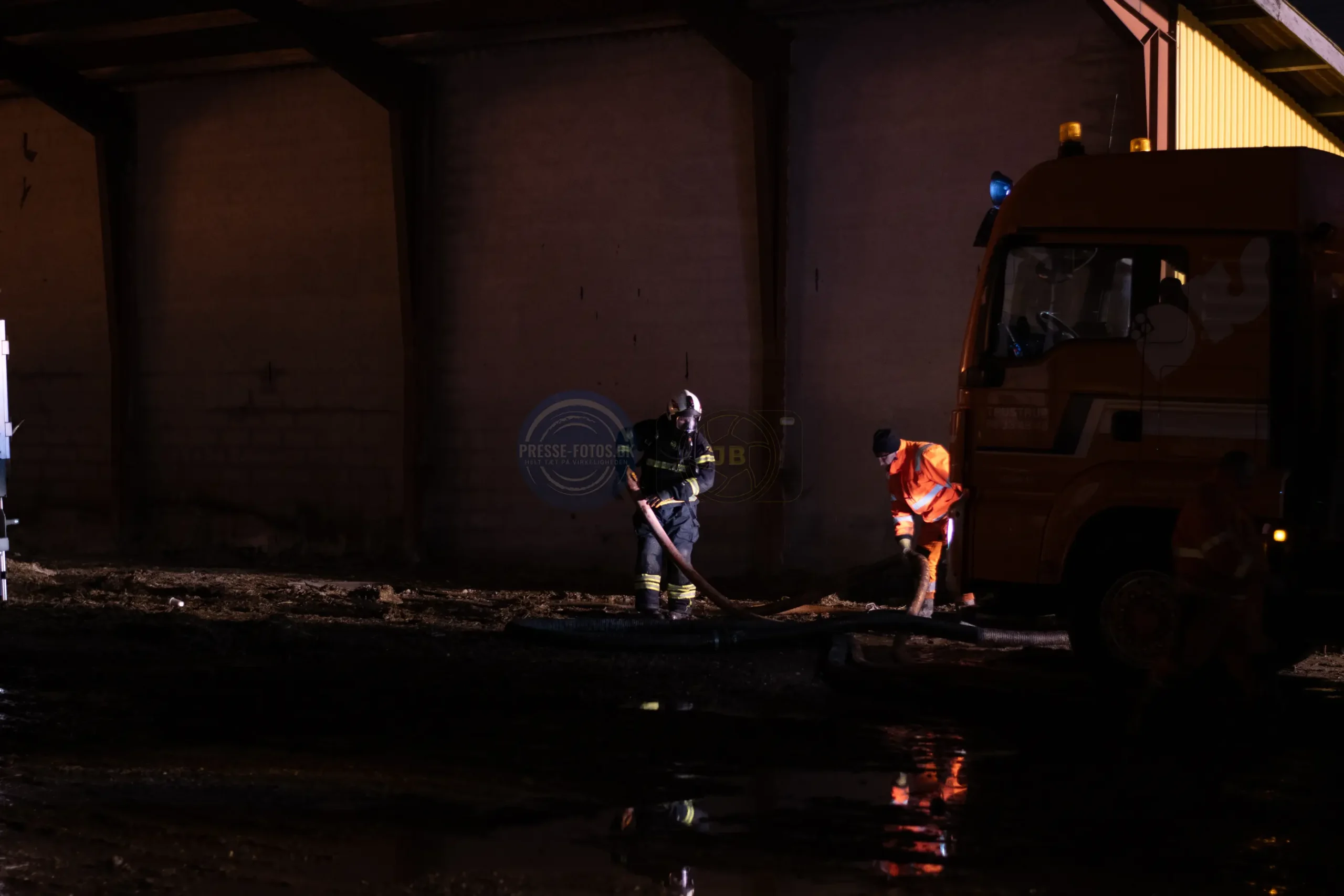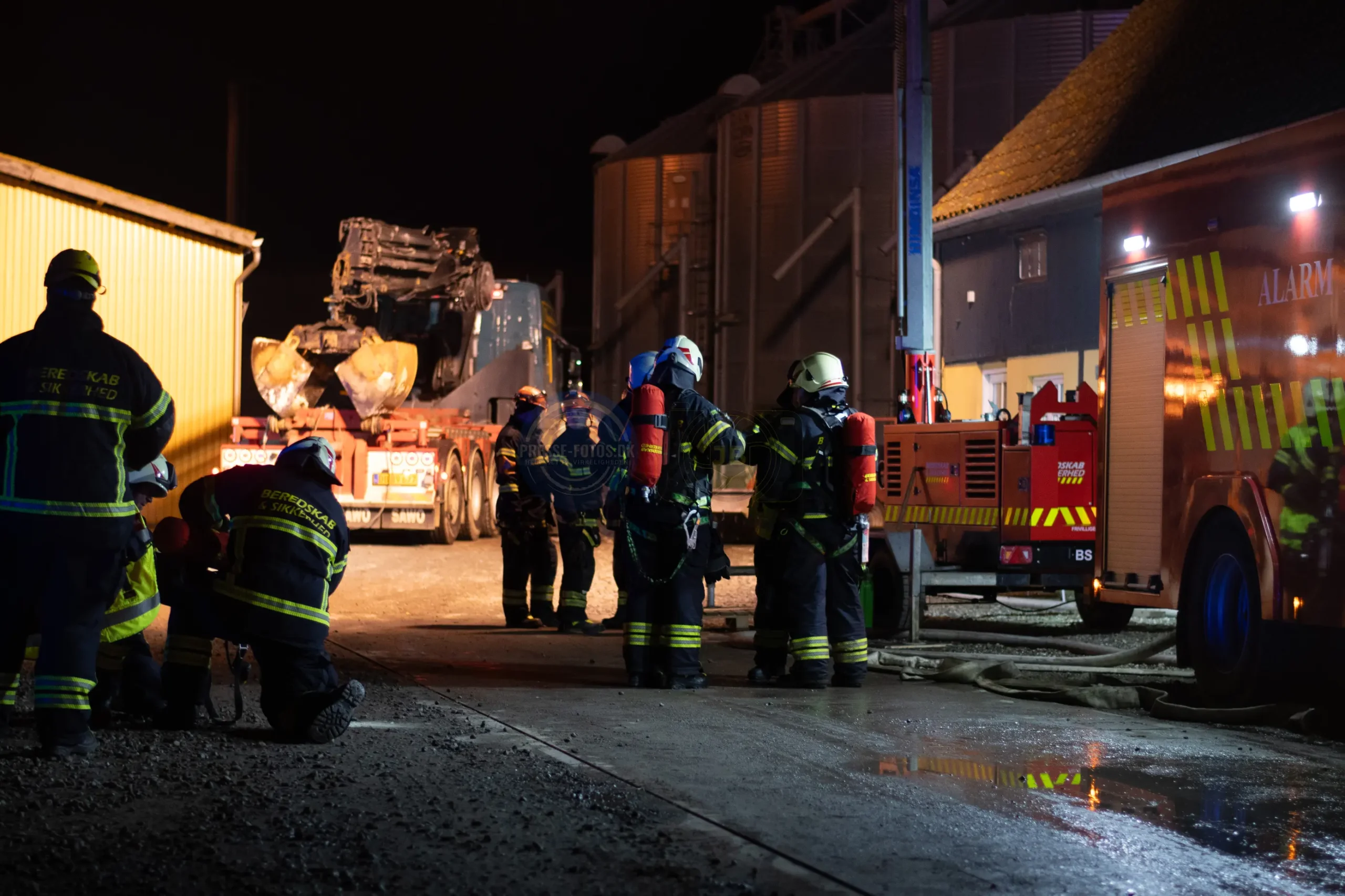 Branden er startet i en lastbil, som står inde i laden. Lastbilen var i gang med at læse kunstgødning af, da der opstod brand under køretøjet og flammerne fik fat i lastbilen og laden ved ved det historiske Møllerup Gods ved Rønde på Djursland.